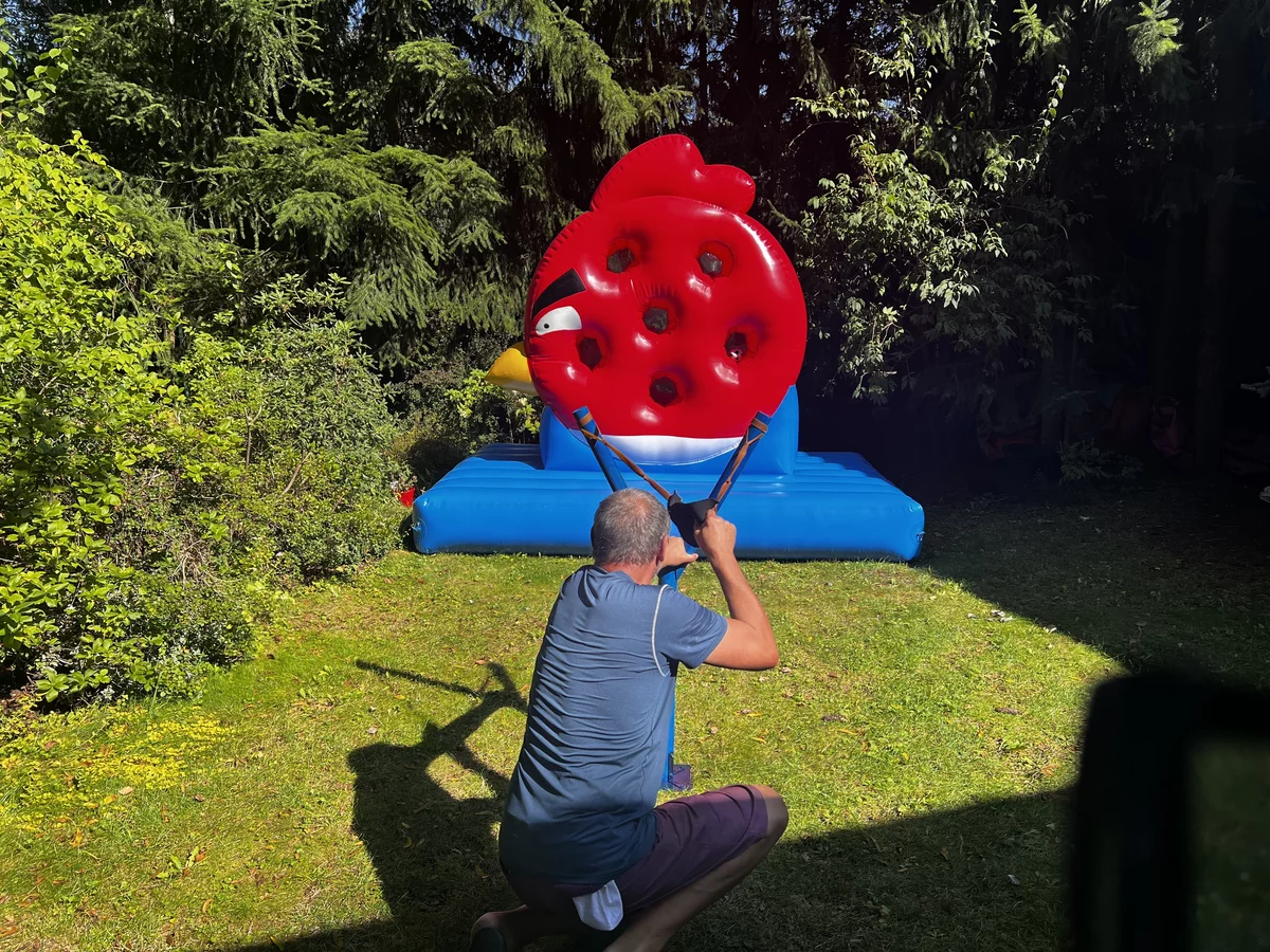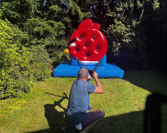 - Nadmuchiwany 5 metrowy Dart. W standardowym darcie, do gry używa się małych lotek, my proponujemy zabawę w kopaniu piłką nożną lub strzelaniu z łuku do wysokiego 5m nadmuchiwanego Darta. Zabawa polega na trafieniu piłką lub strzałą do ponumerowanej tarczy dmuchańca. Tarcza, piłki czy strzały oklejone są rzepem dzięki czemu przyklejają się do siebie i w łatwy sposób można policzyć punkty. Wygrywa ten gracz, który zbierze największą liczbę punktów.